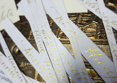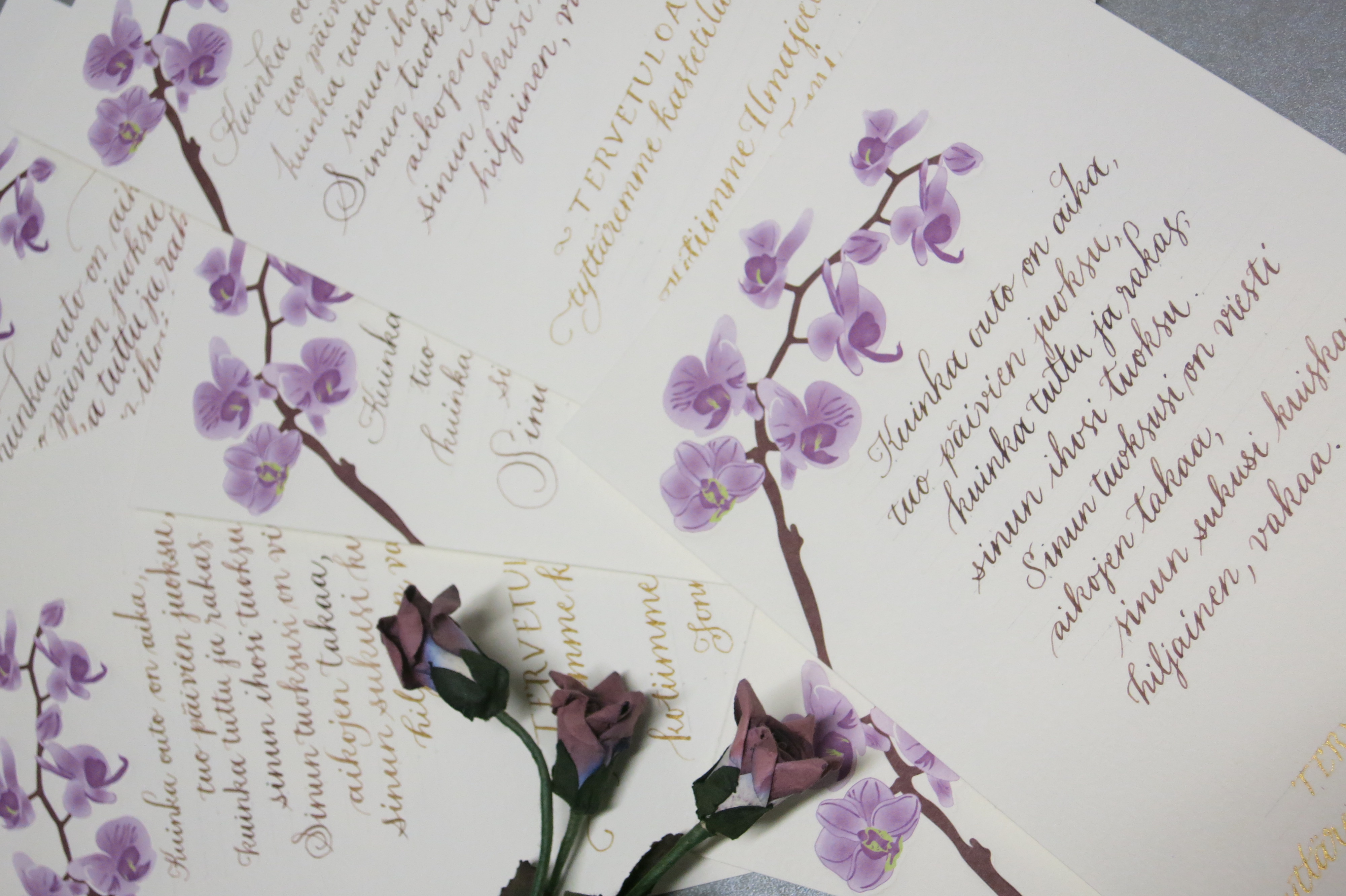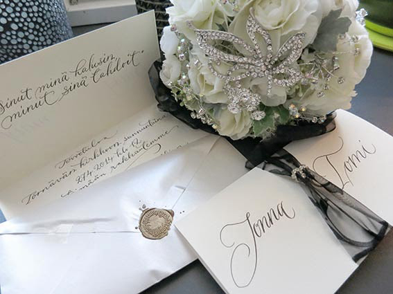 Tekstaan käsin kutsut, kuoret, menut, runot, paikkakortit, save the date -kuoret jne. Suunnittelen digitaalisesti monogrammit tai osan kutsujesi paino”fonteista”, vaikkapa hääparin nimet koukeroisesti kutsuun. Valmistan ja tekstaan kalligrafiset kunniakirjat ja diplomit, kehystettynä valmiiksi saakka, myös yrityksille. Kysy tarjousta ja suunnitellaan yhdessä tarvitsemasi kokonaisuus.